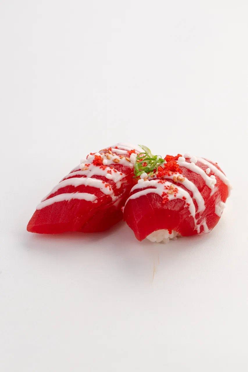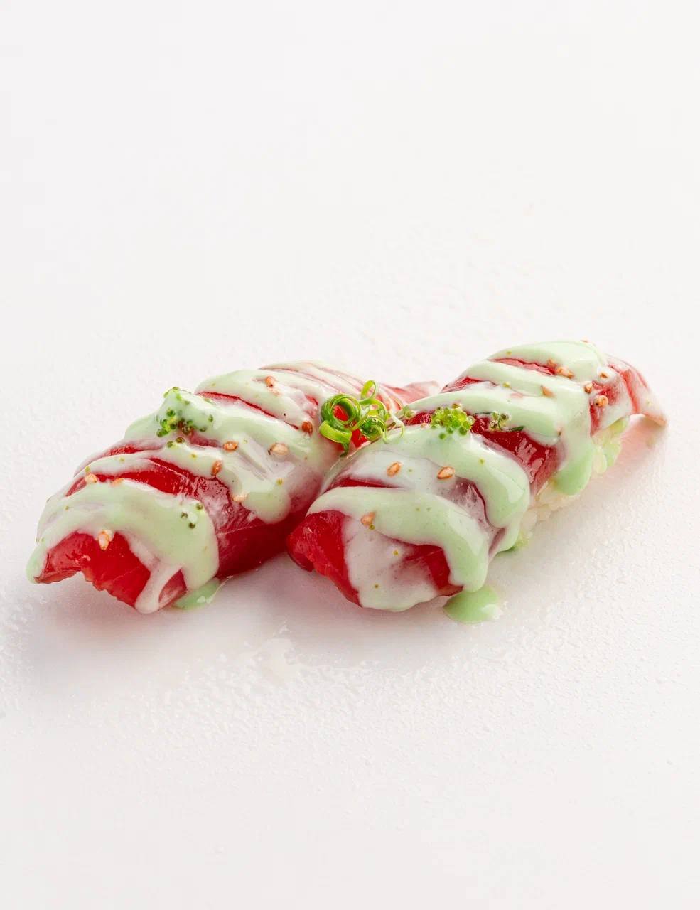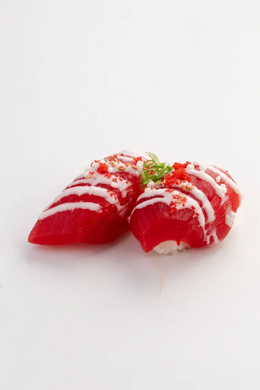 Филе синепёрого тунца, рис, васаби, соус крем васаби, икра тобико, кунжут, зелёный лук.