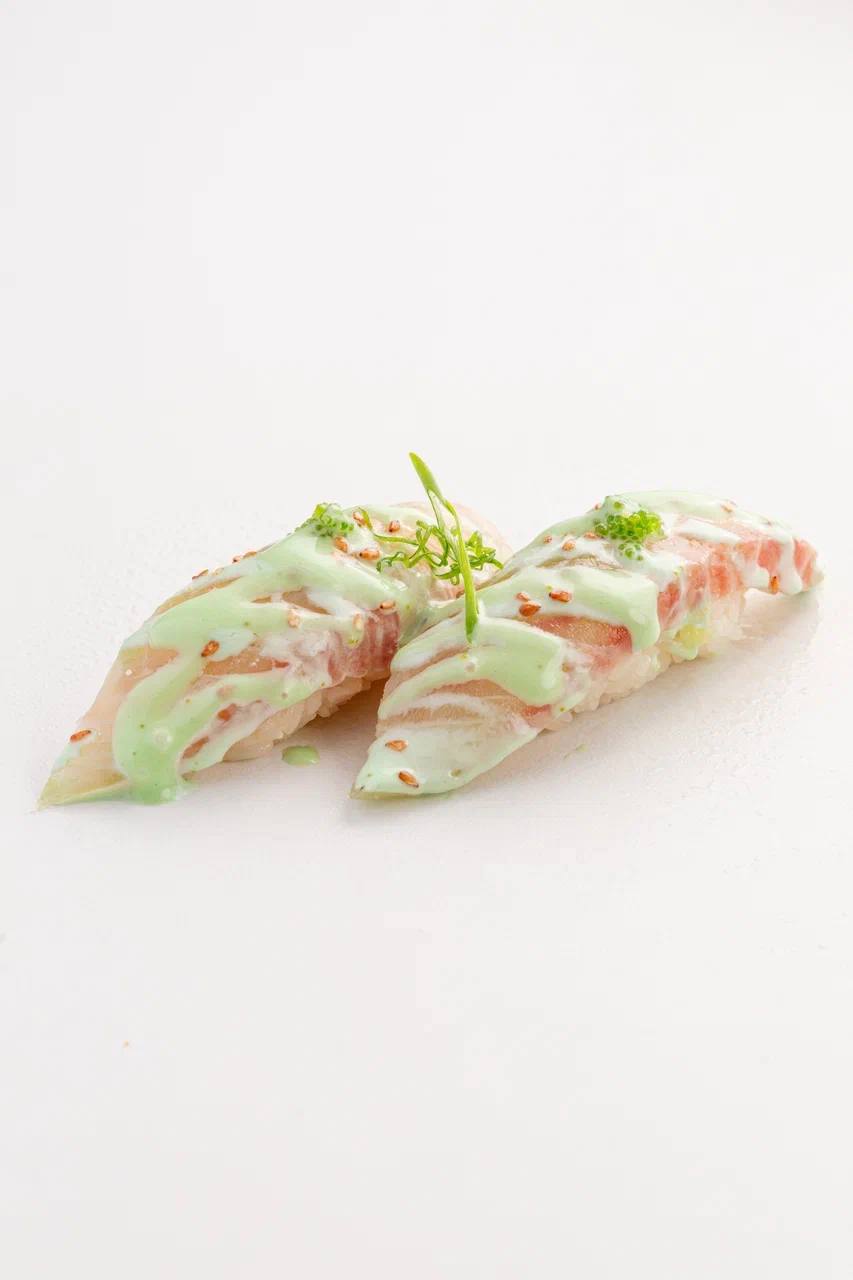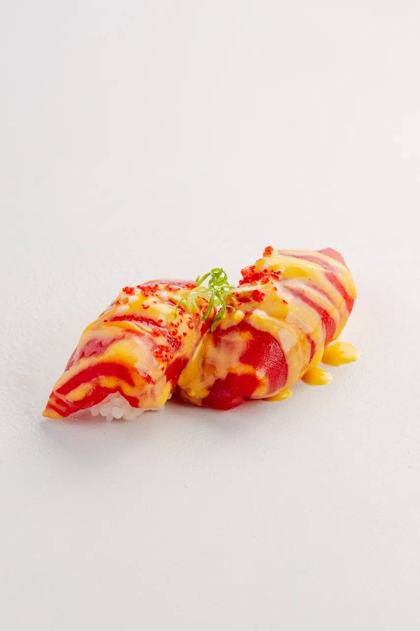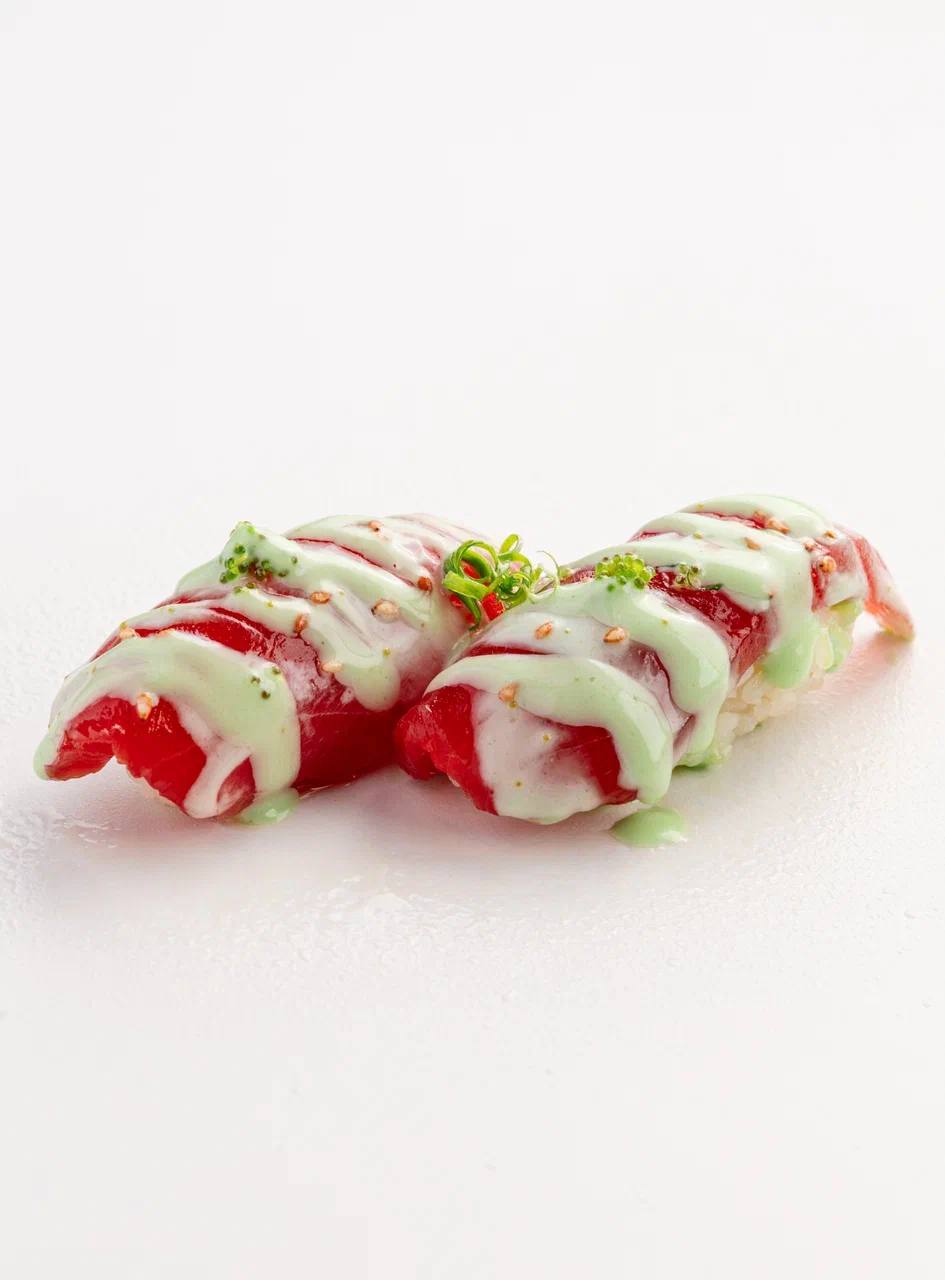 Филе синепёрого тунца, рис, васаби, соус крем васаби, икра тобико, кунжут, зелёный лук.