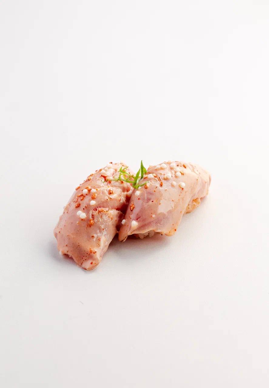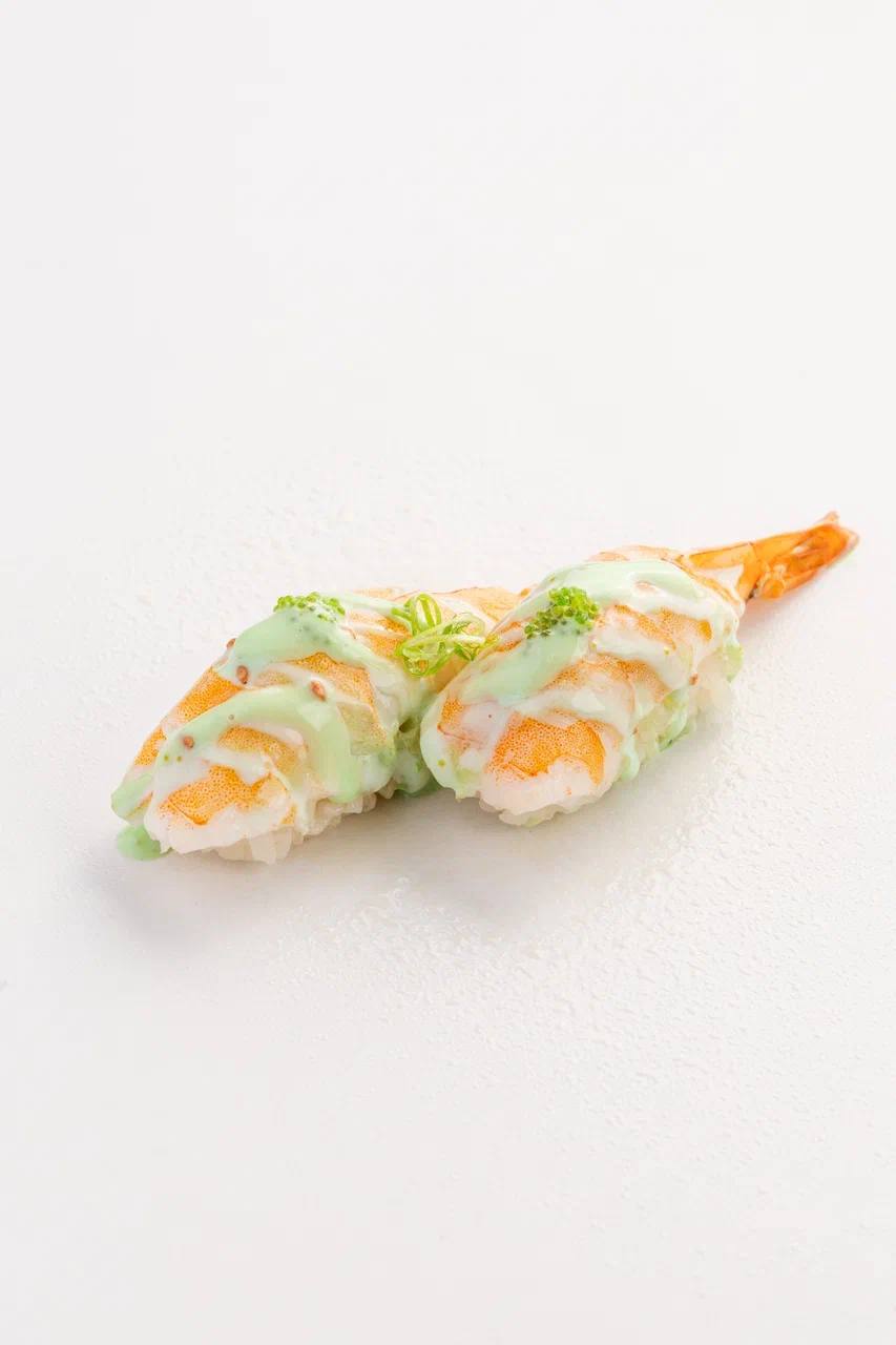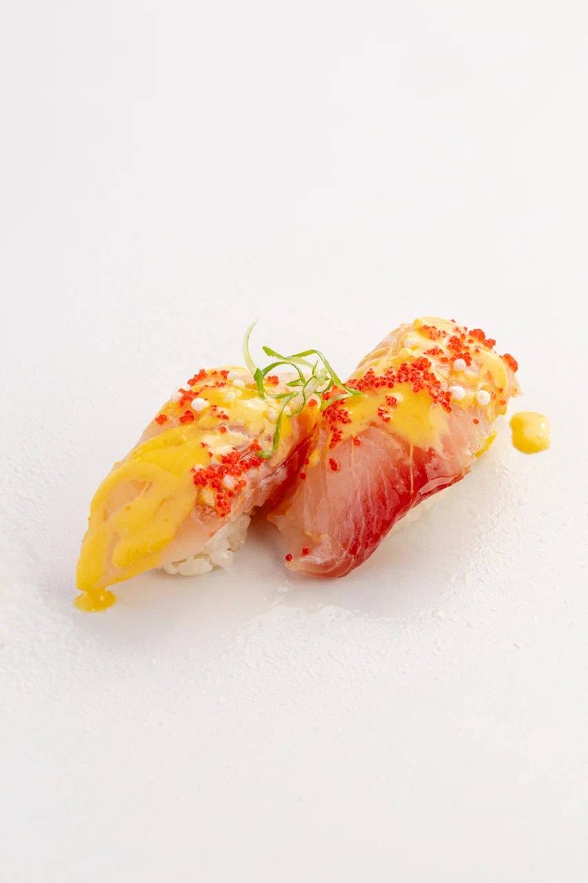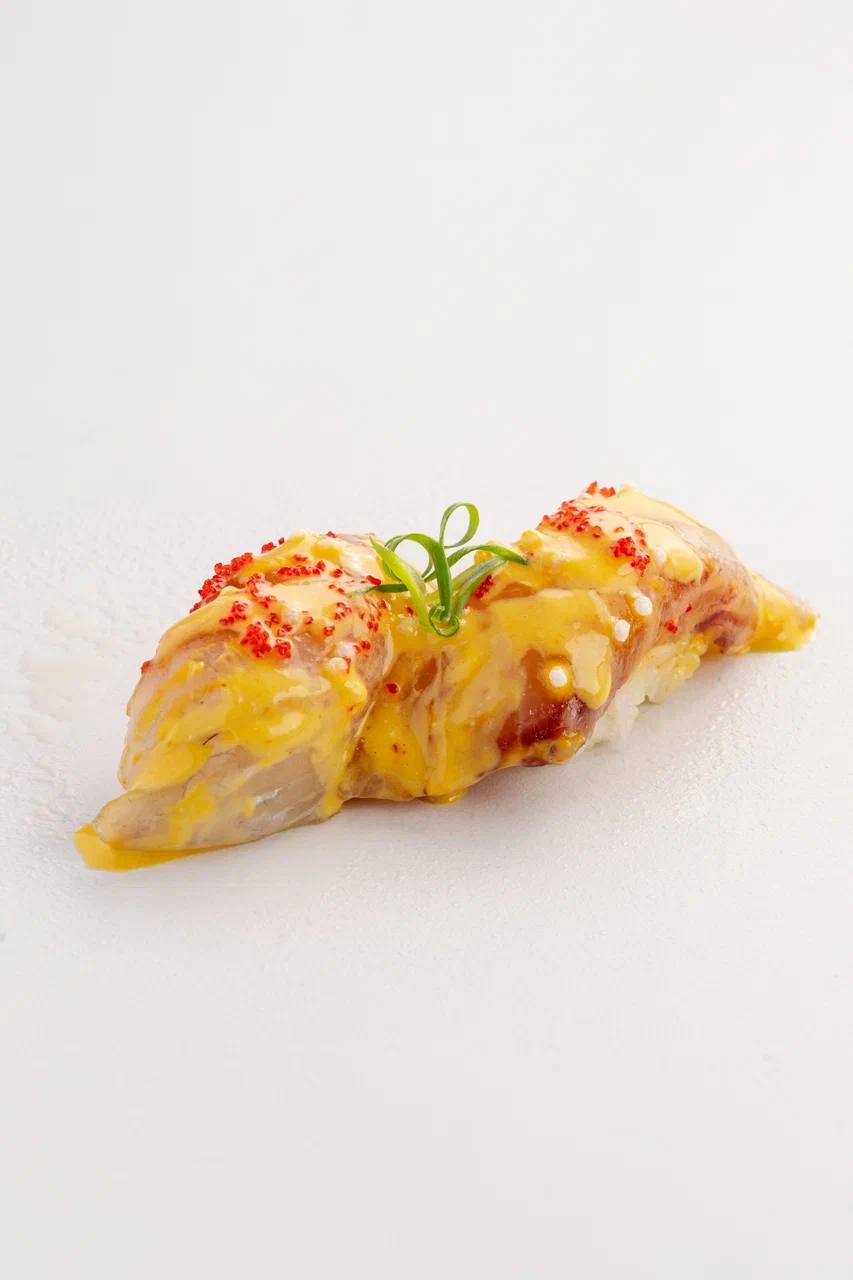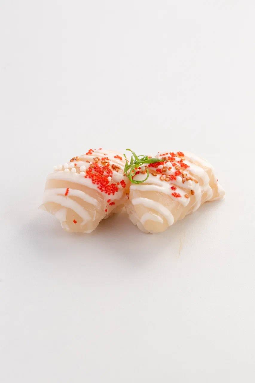 Гребешок, рис, васаби, соус ментайко, икра масаго, водоросли нори.