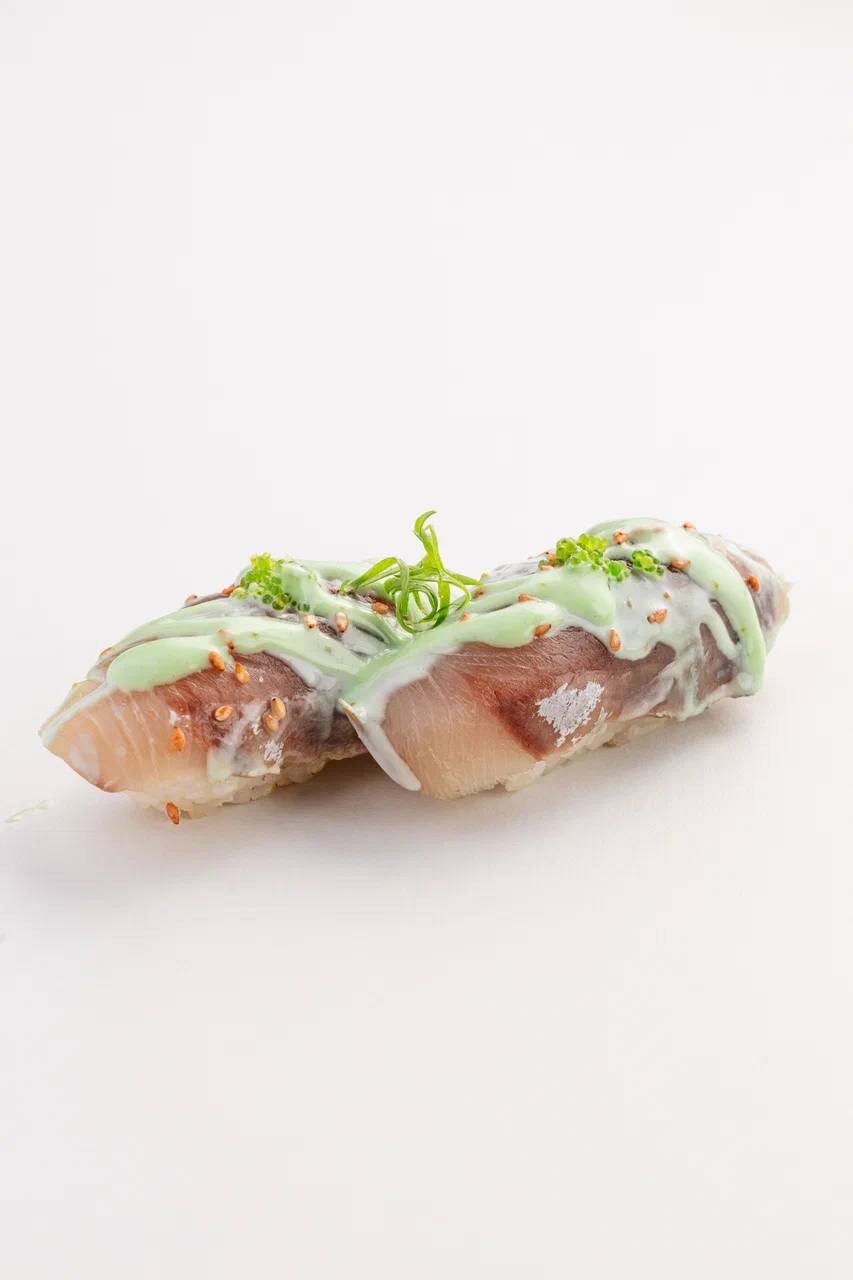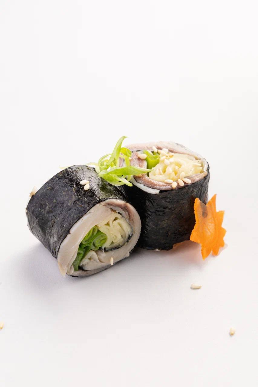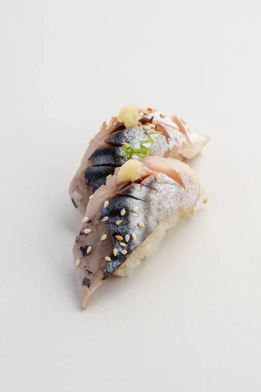 Маринованная скумбрия, зелёный лук, кунжут, маринованный имбирь, соус оса никири, водоросли нори, васаби.