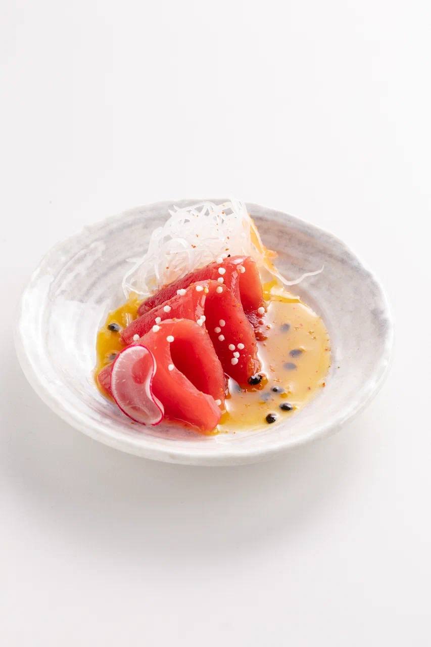 Филе синепёрого тунца, соус тигриное молоко, дайкон, редис, морковь, воздушный рис.