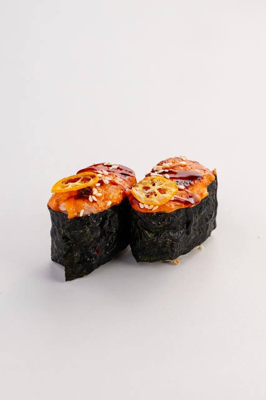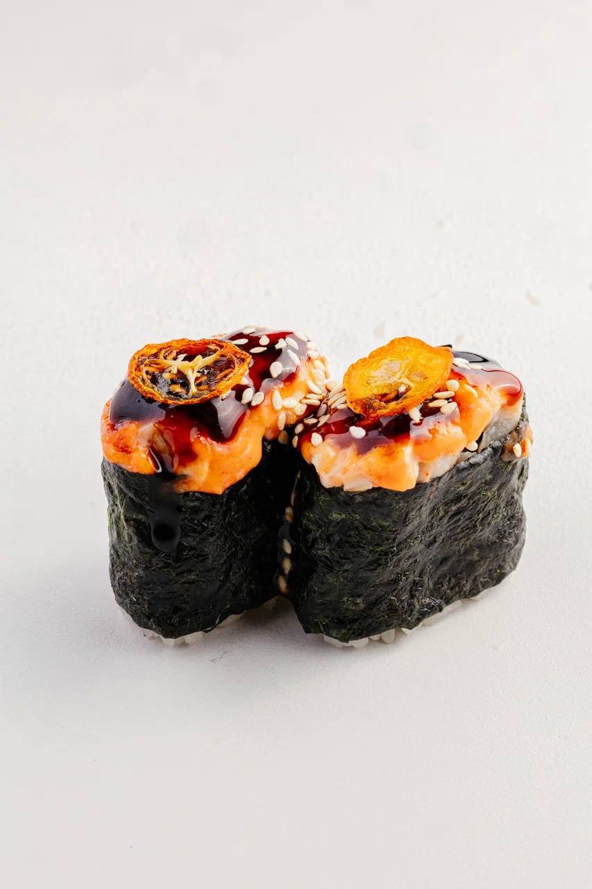 Мясо краба, рис, васаби, соусы спайси и унаги, кунжут, водоросли нори, кумкват.