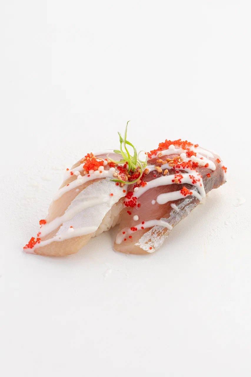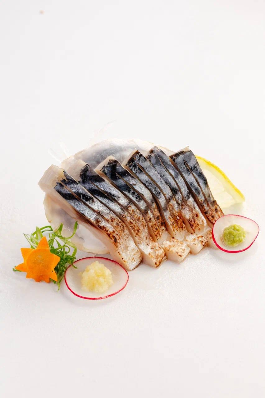 Маринованная скумбрия, дайкон, редис, лимон, васаби, зелёный лук, жареный кунжут, маринованный имбирь.