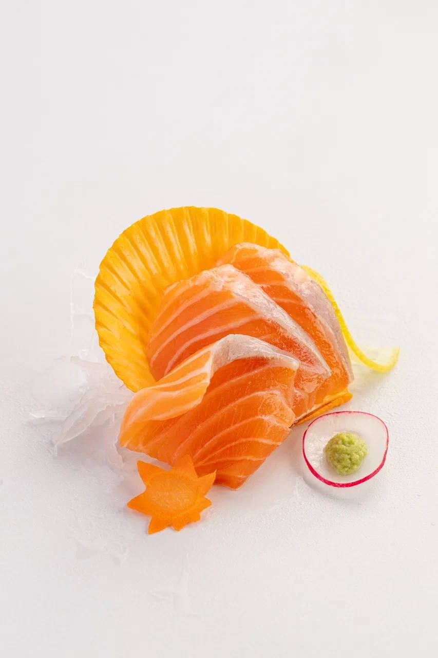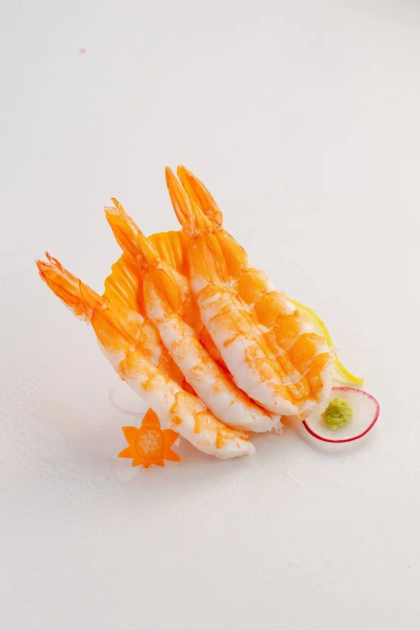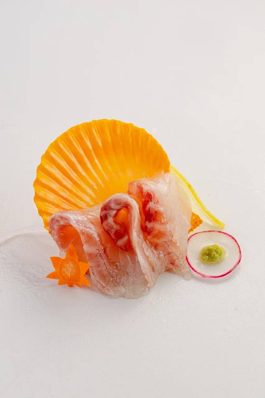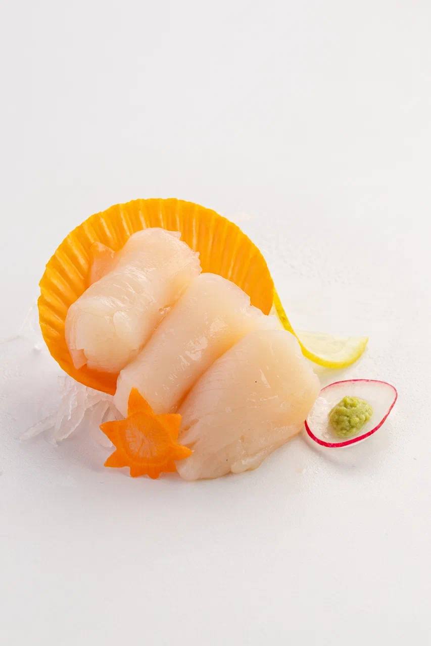 Гребешок, дайкон, морковь, редис, лимон, васаби.