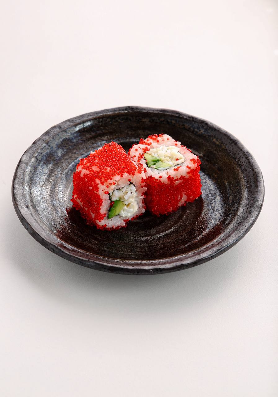 Рис, мясо краба, авокадо, водоросли нори, икра тобико, майонез, васаби.