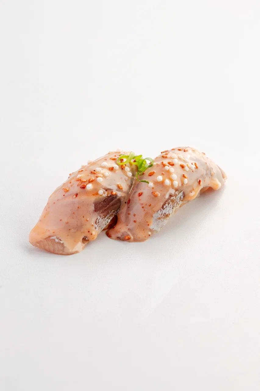 Маринованная скумбрия, рис, зелёный лук, васаби, маринованный имбирь.