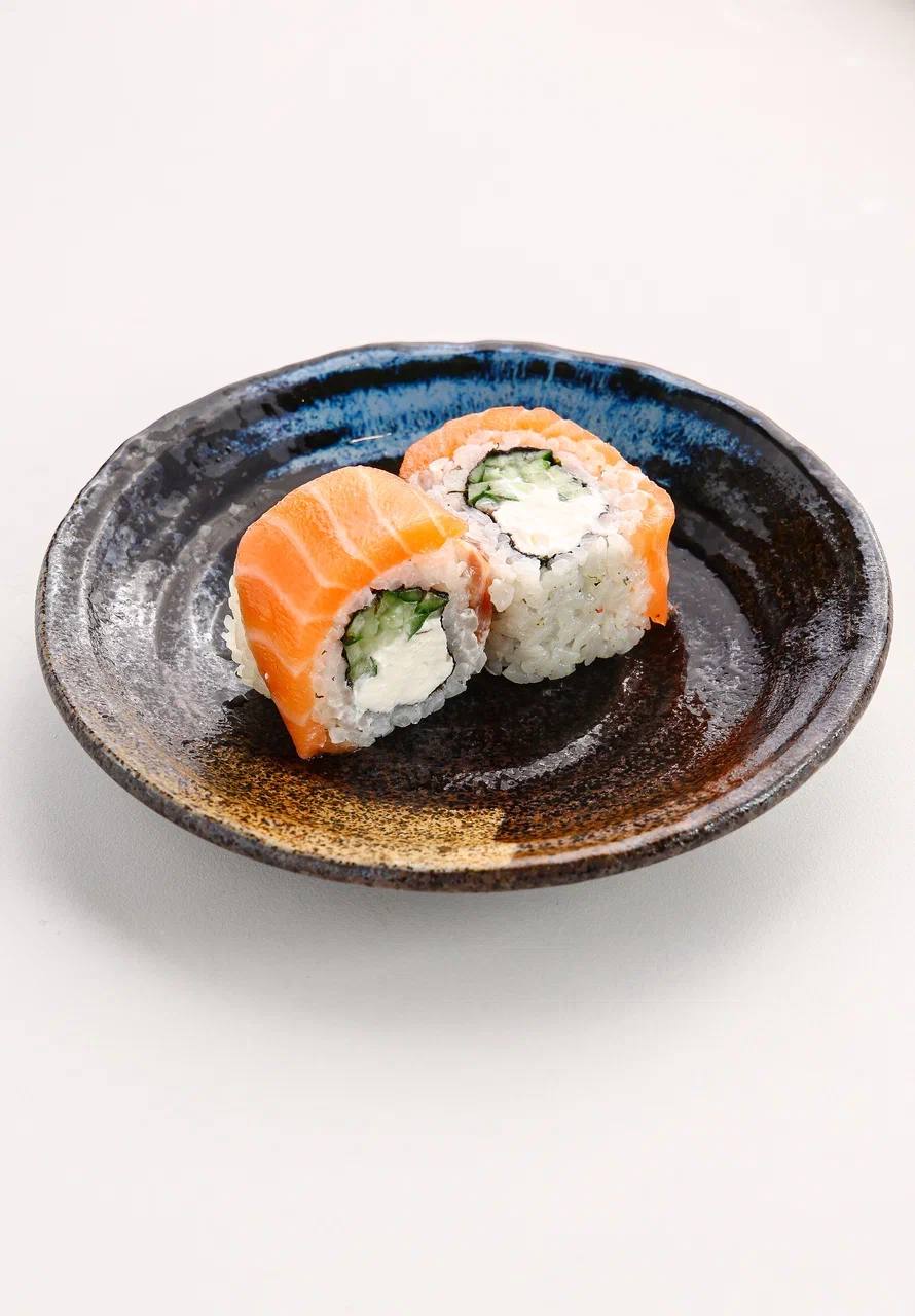 Филе лосося, рис, творожный сыр, огурец, водоросли нори, васаби.