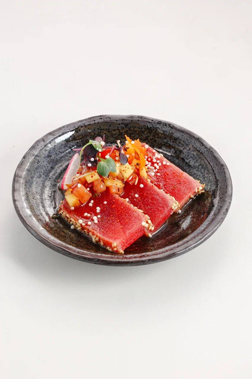 Филе синепёрого тунца, оливковое масло, соус понзу, зелёный манго, томаты, красный лук, микрозлень, кунжут.