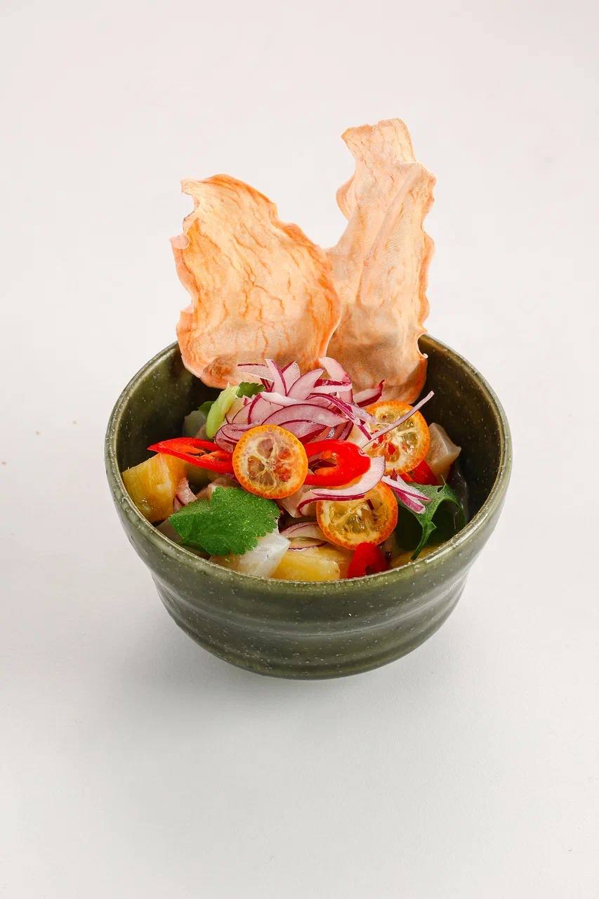 Филе дорадо, соус лече де тигре, красный лук, бобы эдамаме, ананас, перец чили, кинза, батат, кумкват.