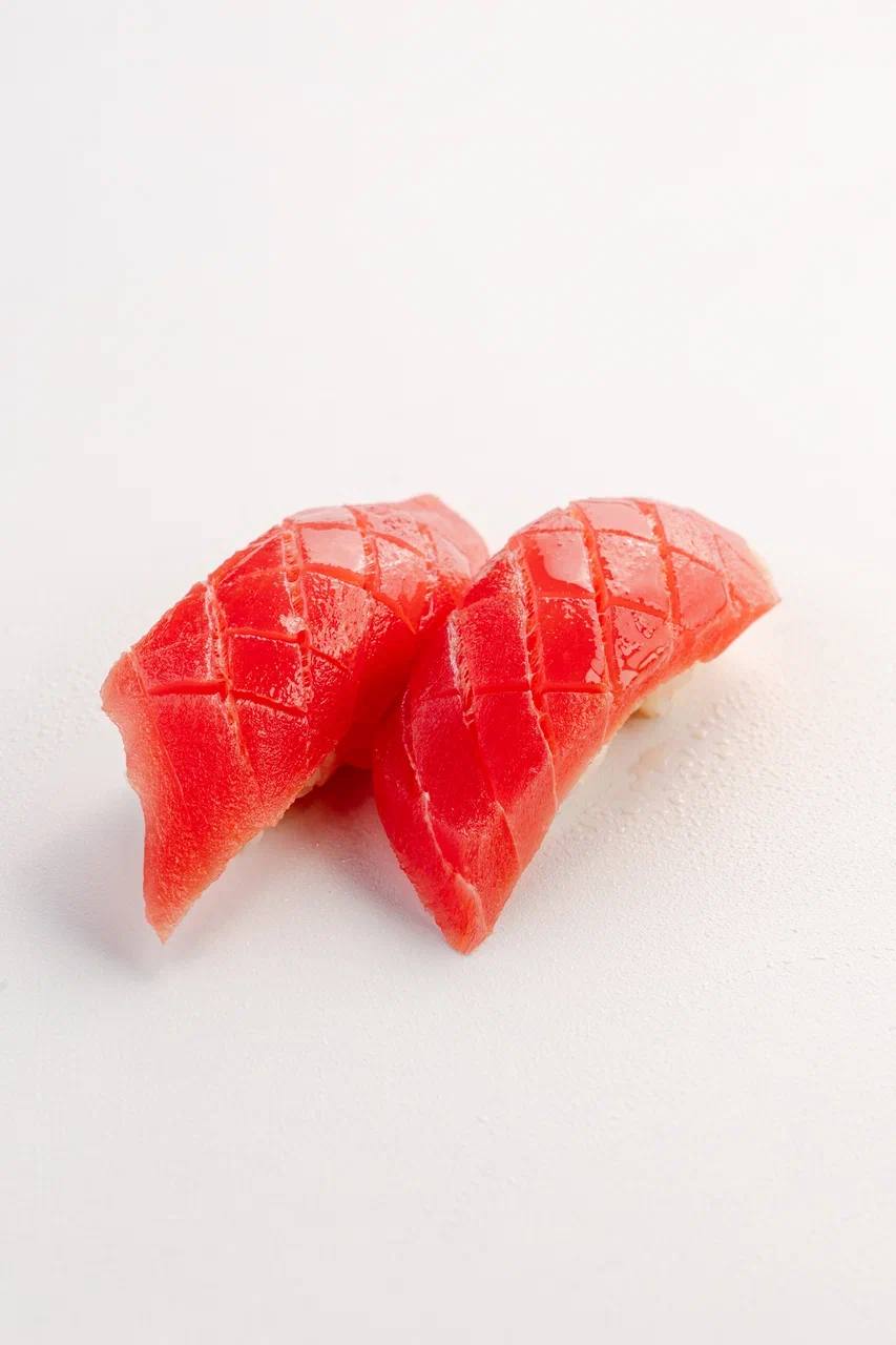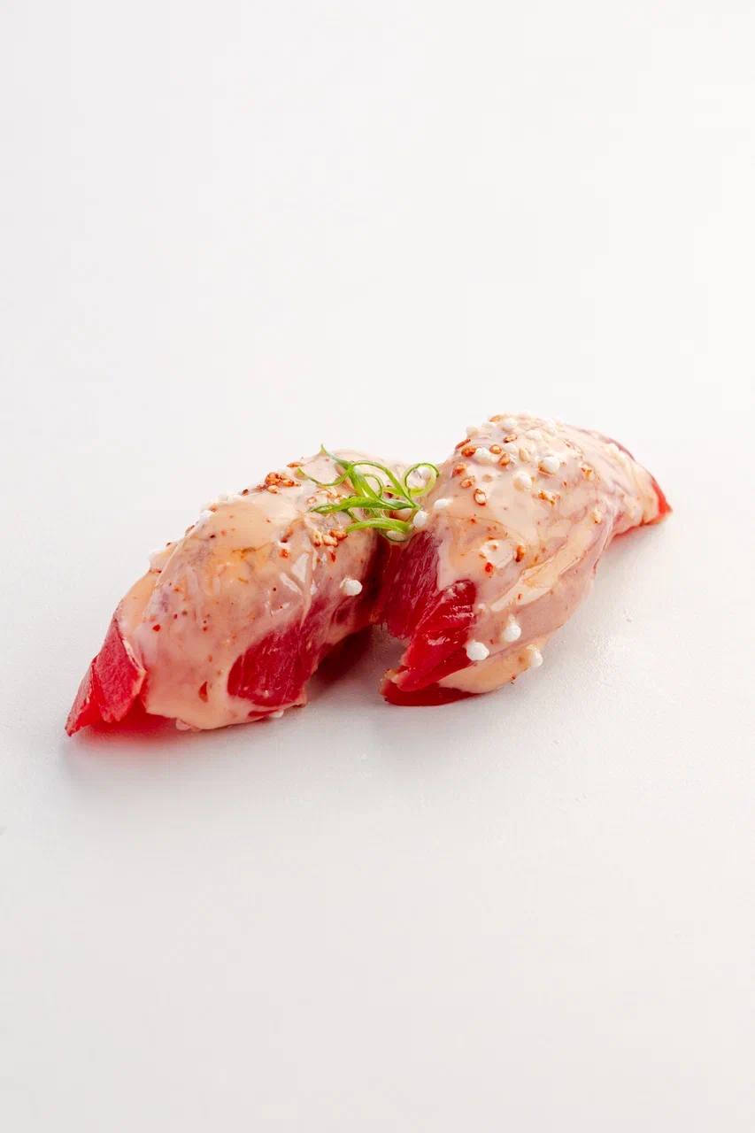 Филе синепёрого тунца, рис, васаби, соусы спайси и унаги, кунжут, водоросли нори, кумкват.