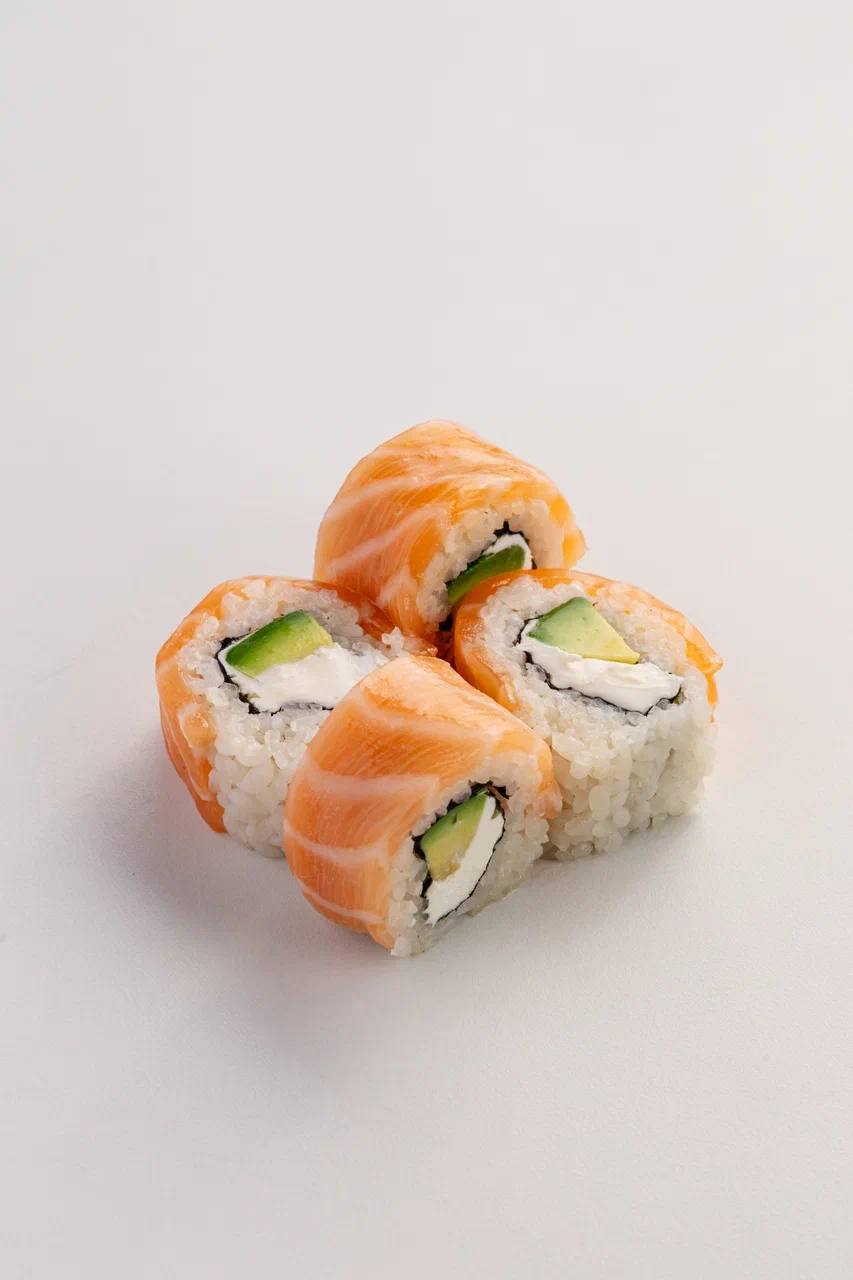 Филе лосося, рис, творожный сыр, авокадо, водоросли нори, васаби.