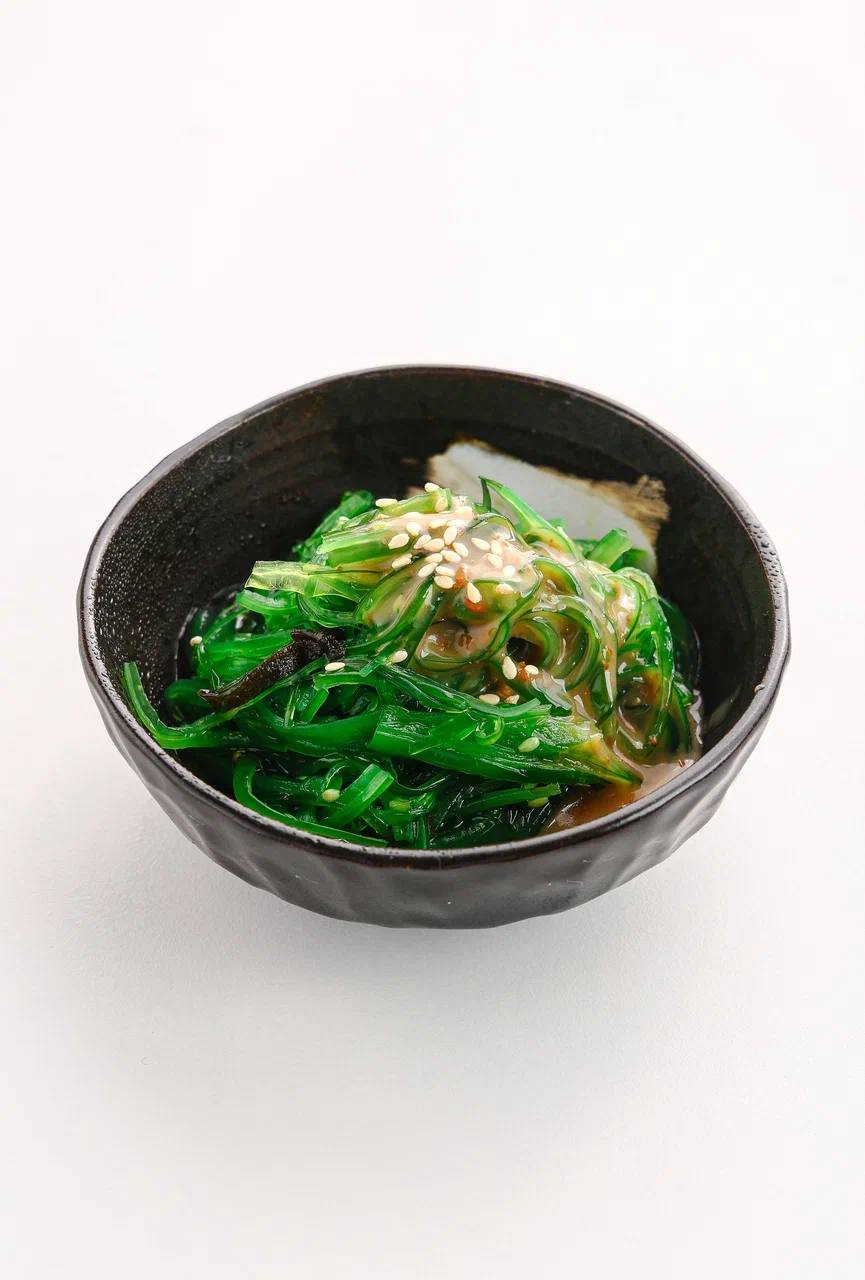 Водоросли вакаме, сливочно-кунжутный соус, кунжут, лимон.