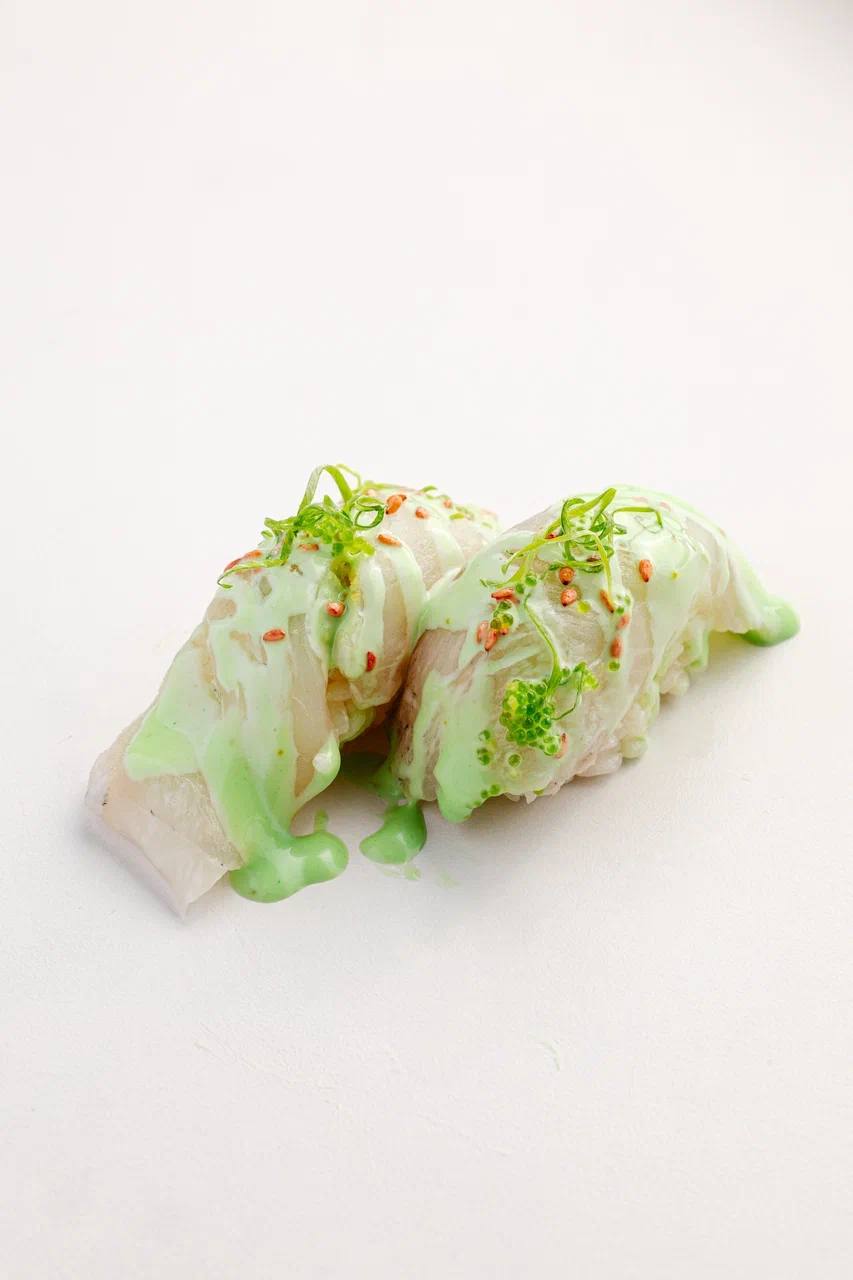 Филе дорадо, рис, васаби, соус крем аоджисо, икра масаго, воздушный рис, кунжут, зелёный лук.