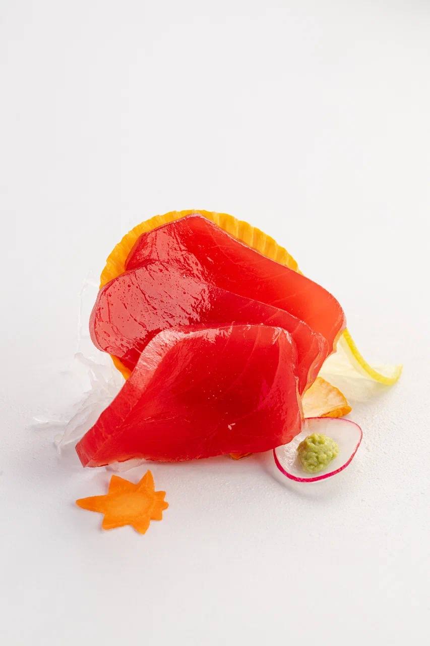 Филе синепёрого тунца, дайкон, морковь, редис, лимон, васаби.