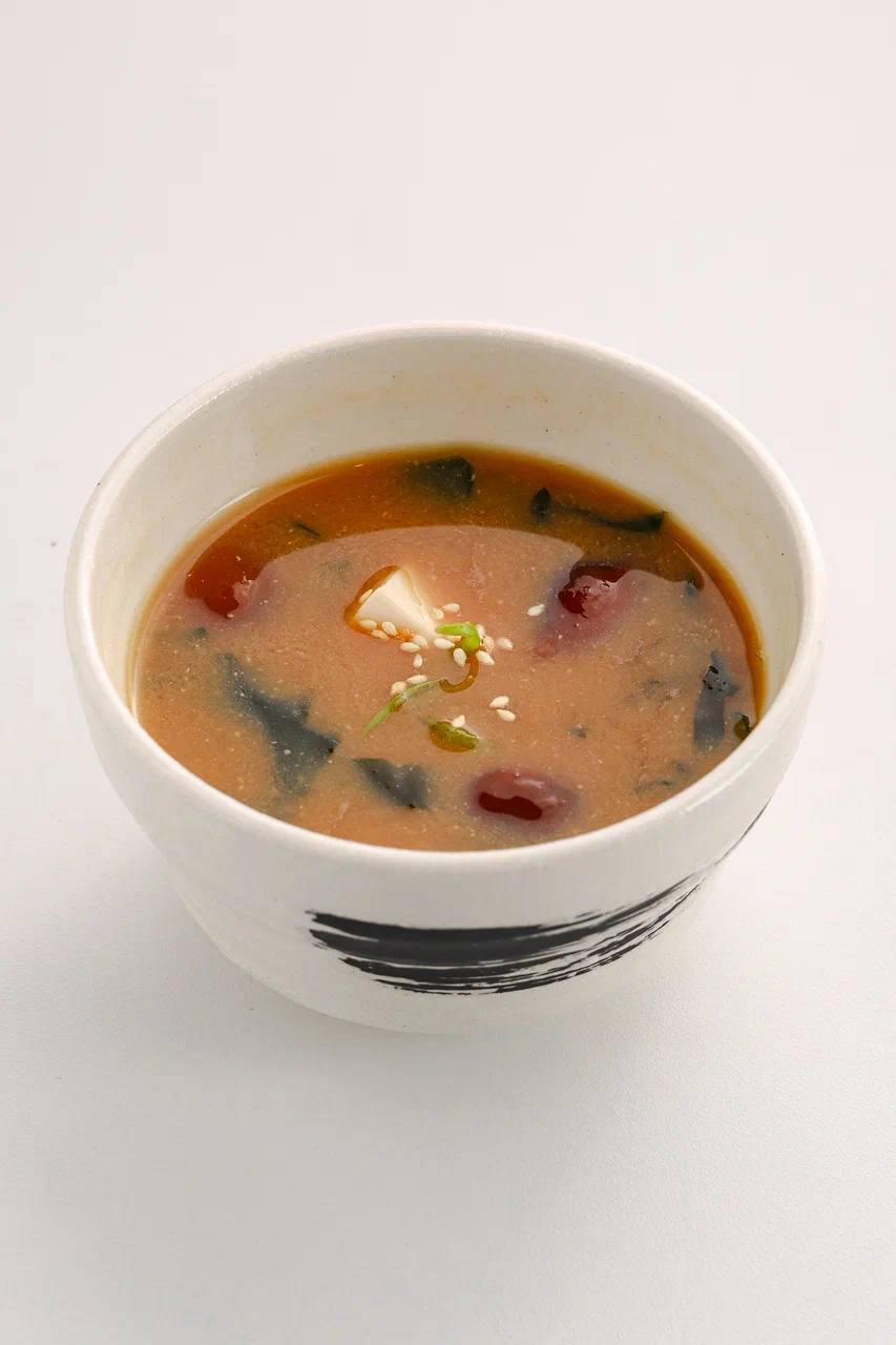Бульон мисо, водоросли вакаме, лук порей, кунжут, кунжутное масло, шёлковый тофу.